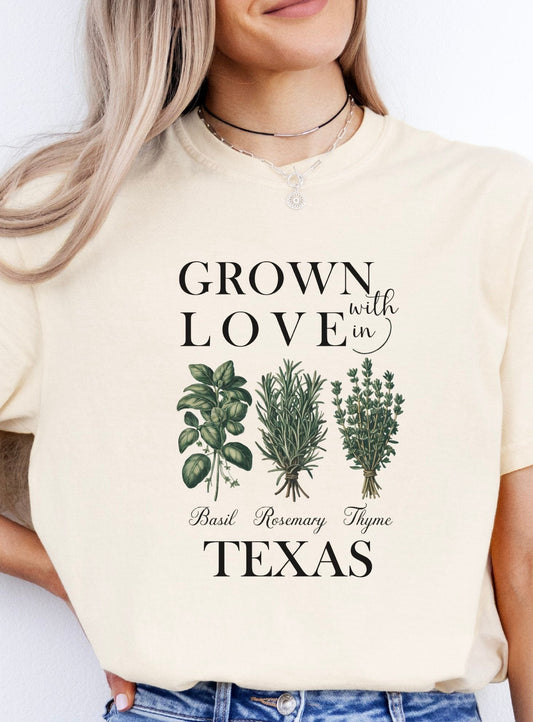 Grown with Love in Texas Herb Themed Graphic T-Shirt
